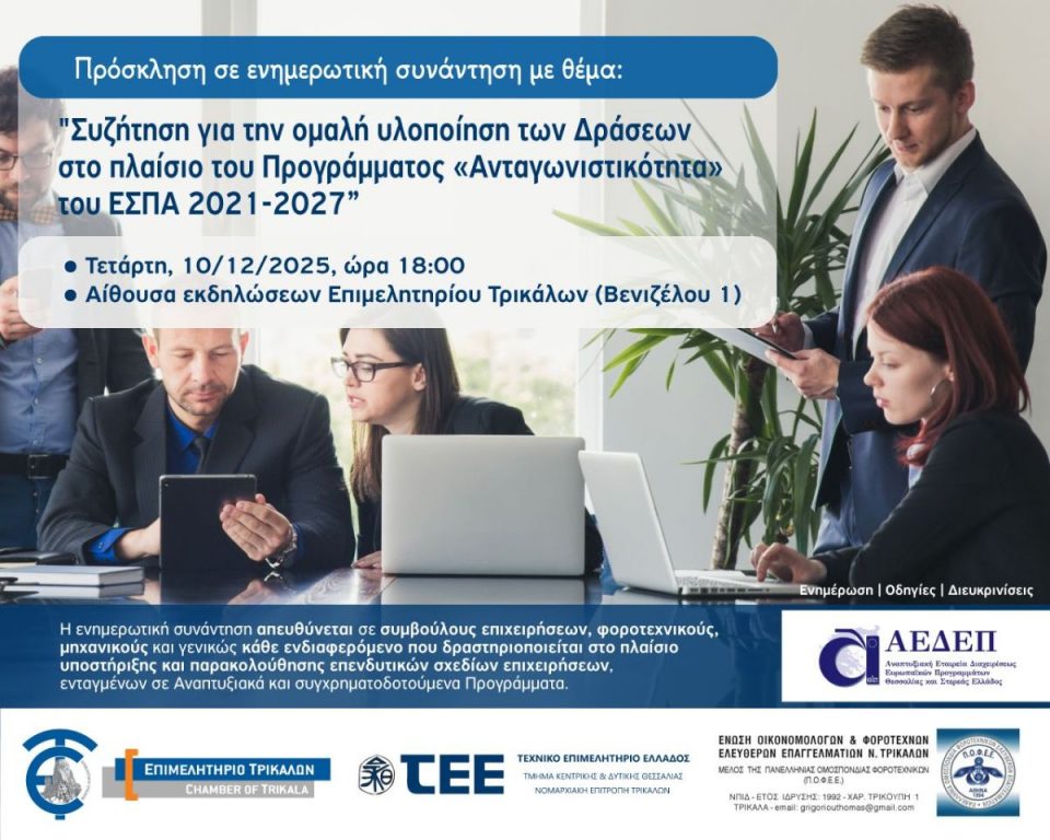 To Επιμελητήριο Τρικάλων, η Ν.Ε. Τρικάλων ΤΕΕ/ΚΔΘ και η Ένωση Οικονομολόγων & Φοροτεχνικών Ελευθέρων Επαγγελματιών Ν. Τρικάλων, με στόχο την επιτάχυνση της απορρόφησης των κονδυλίων του ΕΣΠΑ, συνδιοργανώνουν ανοιχτή ενημερωτική συνάντηση με θέμα: “Συζήτηση για την ομαλή υλοποίηση των Δράσεων στο πλαίσιο του Προγράμματος «Ανταγωνιστικότητα» του ΕΣΠΑ 2021-2027”, την Τετάρτη, 10/12/2025 και ώρα 18:00 στην αίθουσα εκδηλώσεων του Επιμελητηρίου Τρικάλων (Βενιζέλου 1).