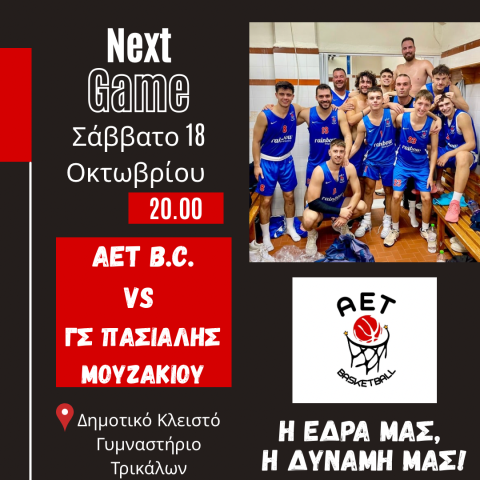 To Σάββατο 18/10 και ώρα 20.00, στο κλειστό γυμναστήριο της Κατσιμήδου, η ΑΕΤ θα ψάξει τη δεύτερη φετινή της νίκη, στην εντός έδρας αναμέτρηση απέναντι στον Πασιαλή Μουζακίου.