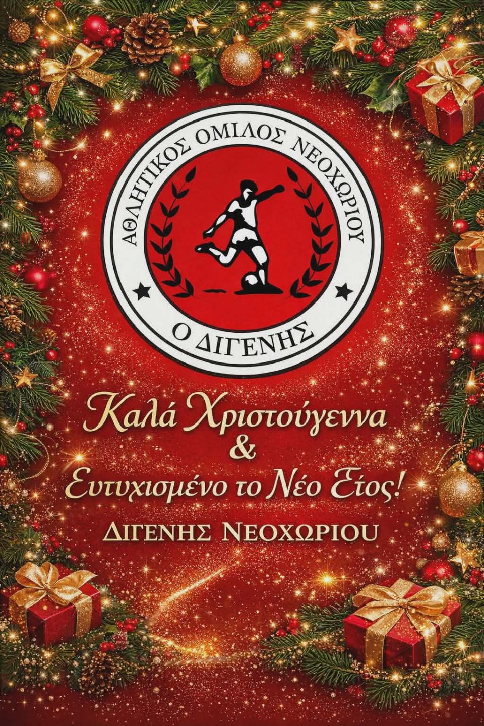 Η διοίκηση , το τεχνικό επιτελείο και οι ποδοσφαιριστές του Αθλητικού Ομίλου Διγενή Νεοχωρίου εύχονται στους χορηγούς , συνδρομητές ,υποστηρικτές , σε όλο το φίλαθλο κόσμο , στους αθλητές και στα σωματεία της περιοχής Καλά Χριστούγεννα με αγάπη , υγεία , ευτυχία και οικογενειακή θαλπωρή .