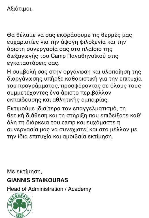 Ευχαριστήριο του υπευθύνου των Ακαδημιών του Παναθηναϊκού στον ΑΟ Τρίκαλα για την φιλοξενία του camp στις εγκαταστάσεις  της Σωτήρας.