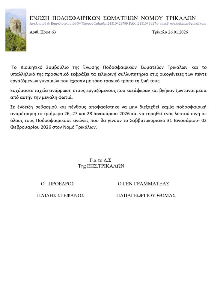 Η  ΕΠΣΤ εξέδωσε τη δική της ανακοίνωση για το τραγικό συμβάν στο εργοστάσιο της Βιολάντα, αναφέροντας ότι ως φόρο τιμής στα θύματα θα τηρηθεί ενός λεπτού σιγή πριν τη σέντρα όλων των αναμετρήσεων του Σαββατοκύριακου.
