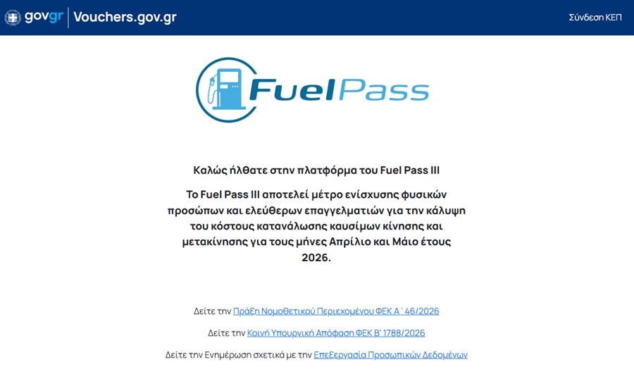Μέσω της της πλατφόρμας vouchers.gov.gr συνεχίζεται η διαδικασία υποβολής αιτήσεων για το Fuel Pass.