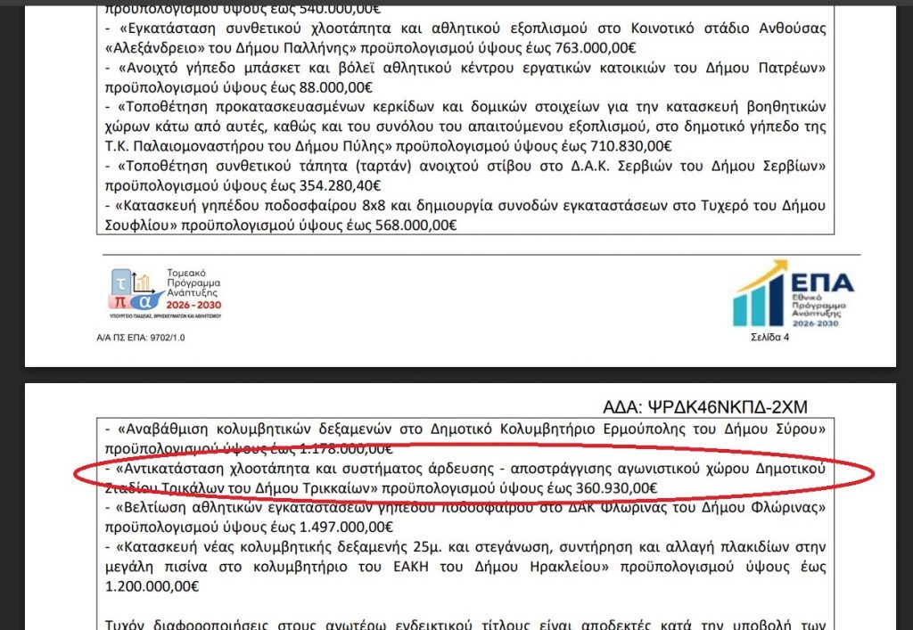 Η πρόσκληση εντάσσεται στο έργο «Βελτίωση, Αναβάθμιση και Ανάπτυξη Αθλητικών