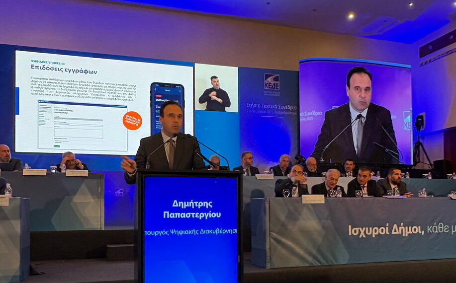 Στη συνέχεια, ο Δημήτρης Παπαστεργίου παρουσίασε τις νέες ψηφιακές υπηρεσίες που διευκολύνουν την καθημερινότητα των ΟΤΑ. Χαρακτηριστικό παράδειγμα η υπηρεσία επιδόσεων εγγράφων μέσω της «Θυρίδας Πολίτη» στο gov.gr και στο Gov.gr Wallet. Όπως ανέφερε ο Υπουργός, ένας Δήμος του μεγέθους του Δήμου Τρικκαίων μπορεί να εξοικονομεί έως και 100.000 ευρώ ετησίως από τις συστημένες επιστολές. Επίσης, τόνισε τη σημασία της «Πλατφόρμας ηλεκτρονικών κατασχέσεων χρηματικών απαιτήσεων οφειλετών ΟΤΑ εις χείρας πιστωτικών ιδρυμάτων», σημειώνοντας ότι μέχρι σήμερα έχουν εκδοθεί 204.268 κατασχετήρια, συνολικού ύψους 391,3 εκατομμυρίων ευρώ, μειώνοντας τη γραφειοκρατία και επιταχύνοντας την είσπραξη εσόδων για τους Δήμους.