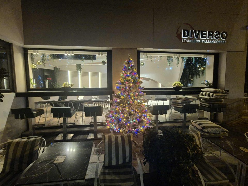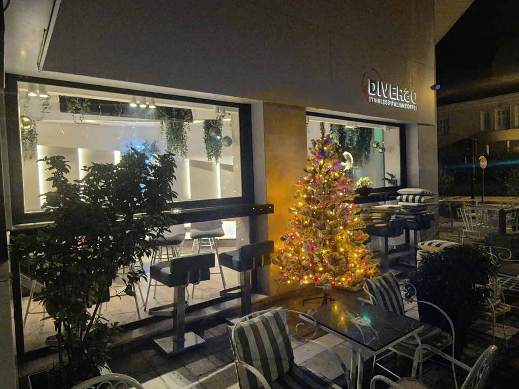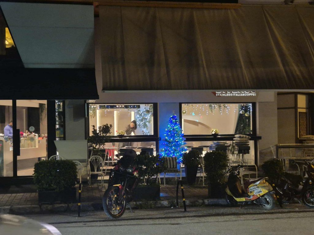 Τα γιορτινά του φόρεσε το αγαπημένο καφέ της πόλης, το Diverso Stainless Italian Coffee, που βρίσκεται παραποταμίως επί της οδού Κανουτά.