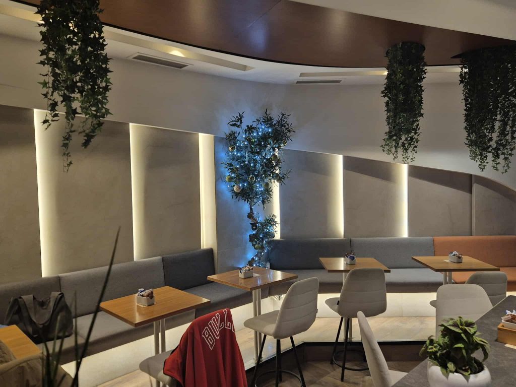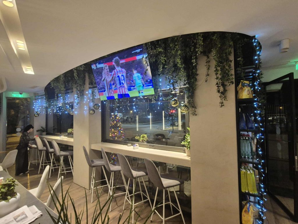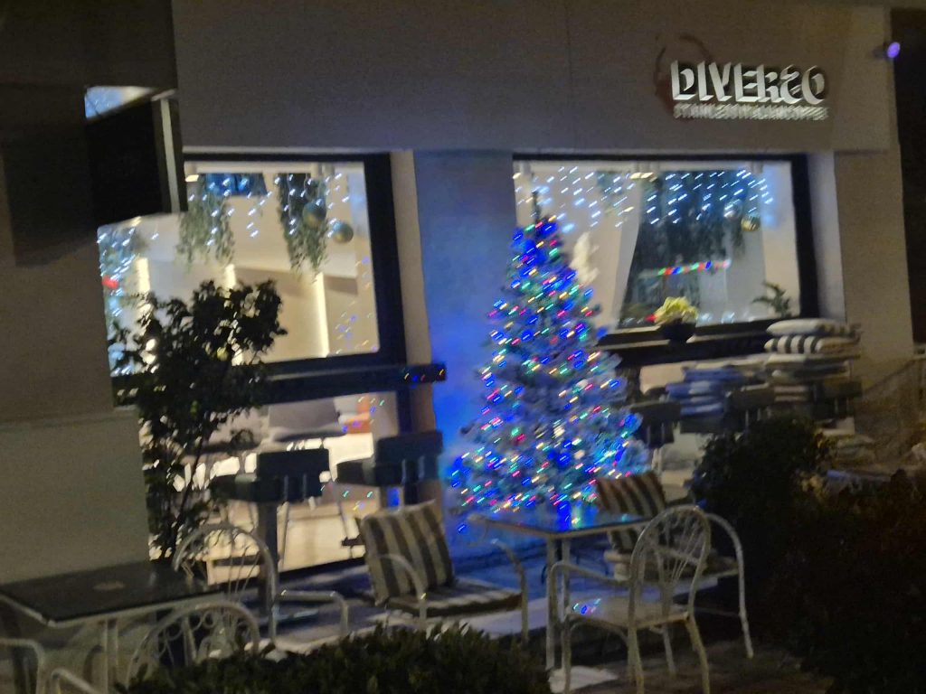 Εξωτερικά έχει στολιστεί το Χριστουγεννιάτικο δέντρο, ενώ και στο εσωτερικό του μαγαζιού, εκατοντάδες λαμπιόνια δίνουν ένα ιδιαίτερο χρώμα.
