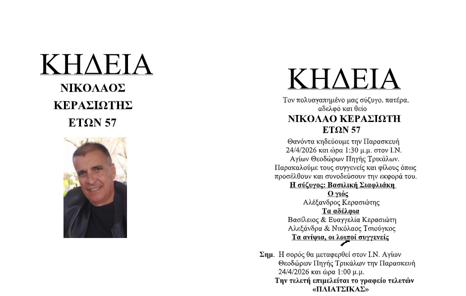 Θλίψη σκορπάει στην τοπική μας κοινωνία η είδηση του θανάτου του Νίκου Κερασιώτη, ο οποίος έφυγε πρόωρα από τη ζωή, σε ηλικία μόλις 57 ετών.