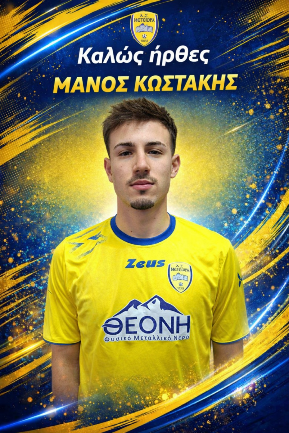 Ο ΑΣ Μετέωρα βρίσκεται στην ευχάριστη θέση να ανακοινώσει την έναρξη της συνεργασίας του με τον 21χρονο μεσο-επιθετικό Μάνο Κωστάκη ο οποίος αγωνιζόταν μέχρι πρότινος στον Απόλλων Λυγαριάς. Τον καλωσορίζουμε και του ευχόμαστε να είναι υγιής και να έχουμε μία άψογη συνεργασία.