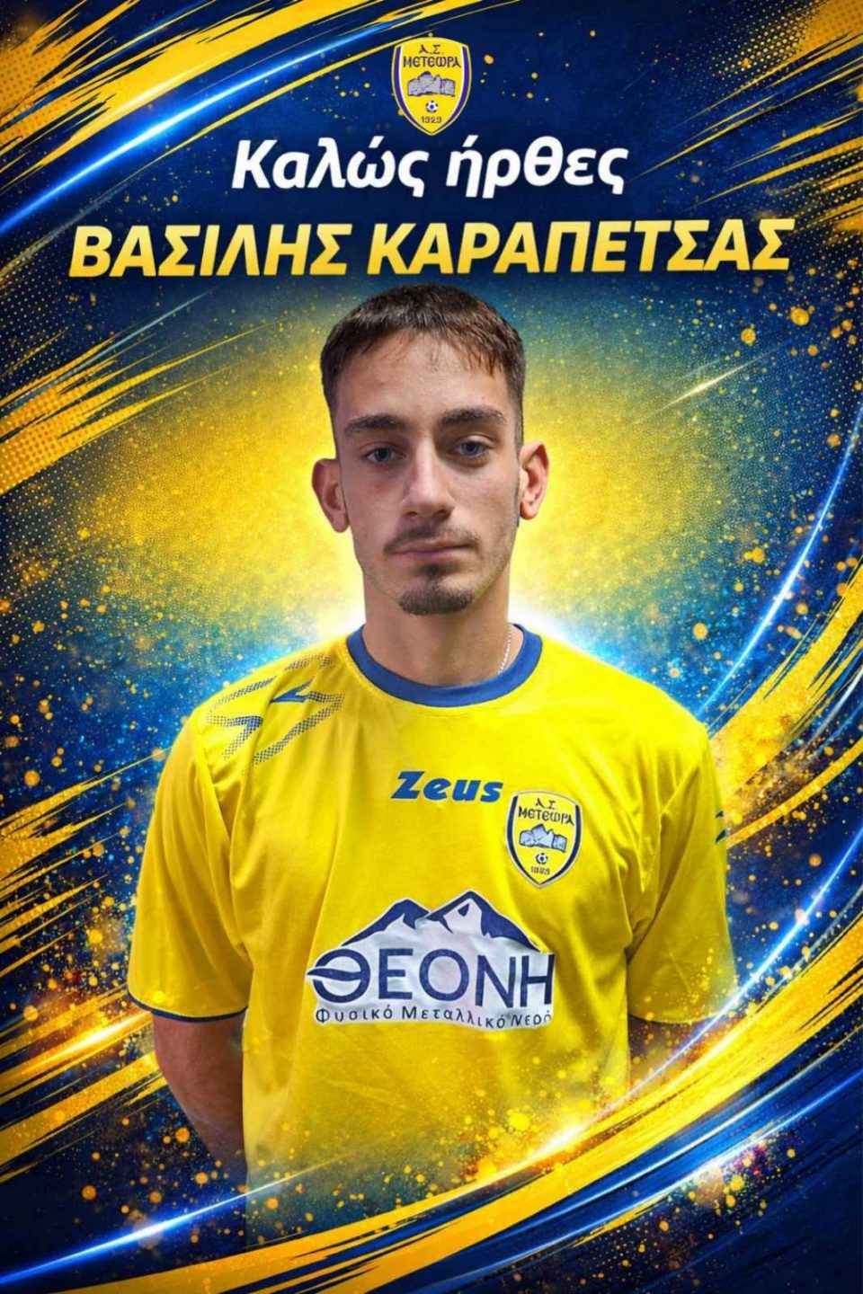 Ο ΑΣ Μετέωρα ανακοινώνει με μεγάλη χαρά την μεταγραφή του 17χρονου Καλαμπακιώτη ποδοσφαιριστή Βασίλη Καραπέτσα ο οποίος αγωνίζεται ως πλάγιος επιθετικός και μέχρι πρότινος ήταν στον Εθνικό Βράχο Καστρακίου. Τον καλωσορίζουμε και του ευχόμαστε υγεία και επιτυχίες με τα χρώματα της ομάδας μας.