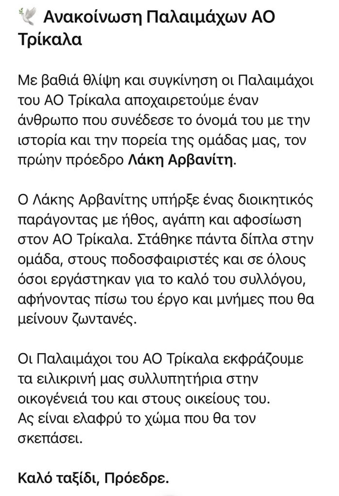 Συλλυπητήρια ανακοίνωση των Παλαιμάχων ΑΟ Τρίκαλα για Λάκη Αρβανίτη