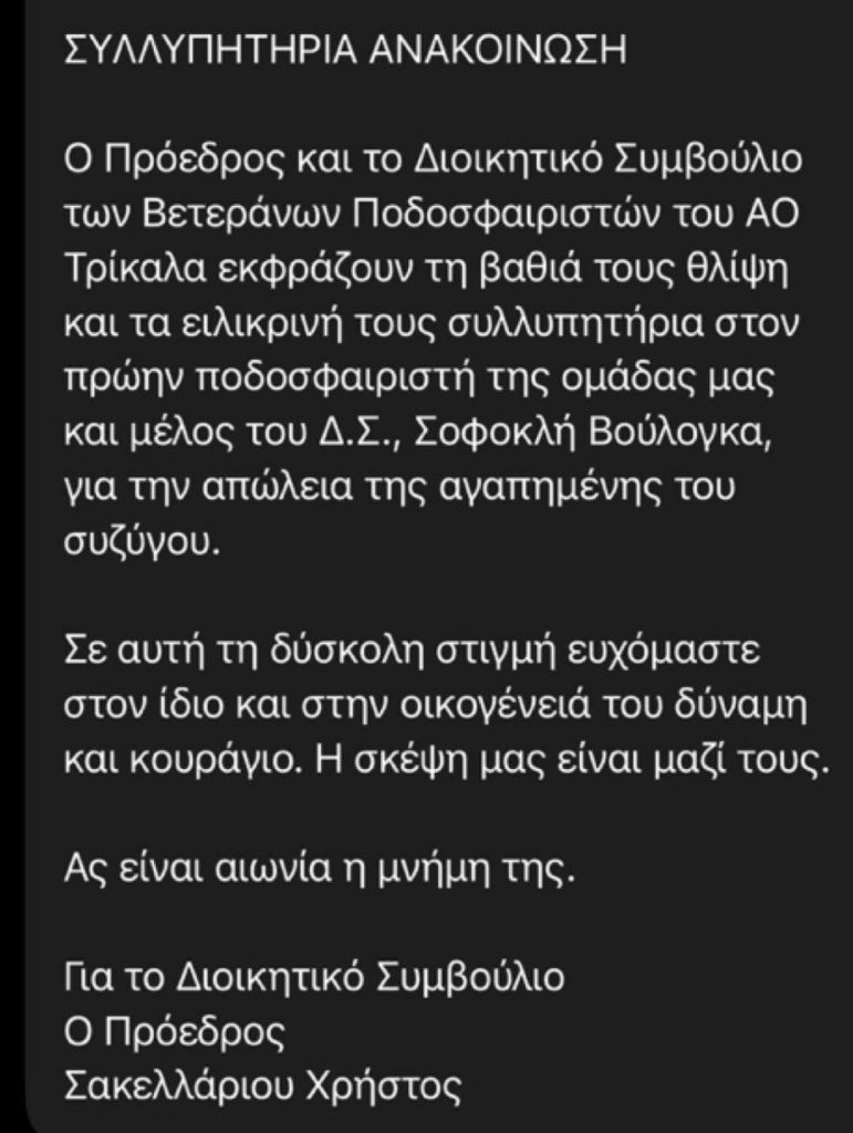 Η οικογένεια του Α.Ο. Τρίκαλα εκφράζει τα θερμά και ειλικρινή συλλυπητήριά της στον παλαίμαχο ποδοσφαιριστή της ομάδας μας, Σοφοκλή Βουλόγκα, για την απώλεια της αγαπημένης του συζύγου.