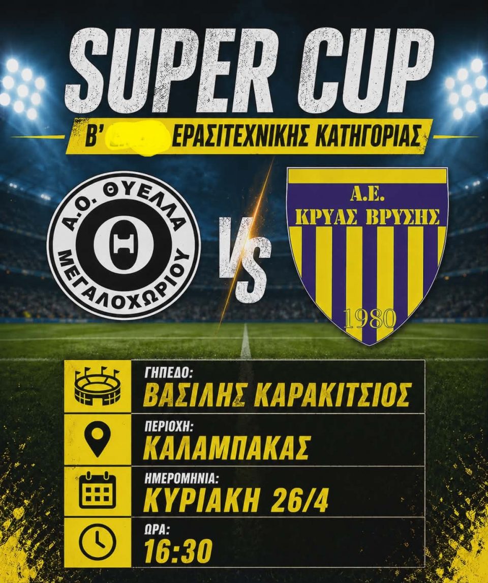 Σήμερα στις 16.30 στο “Β. Καρακίτσιος” της Καλαμπάκας αναμετρώνται η Θύελλα Μεγαλοχωρίου με την Κρύα Βρύση, πρωταθλητές των δύο ομίλων, στα πλαίσια του Σούπερ Καπ της Β’ ΕΠΣΤ, μία αναμέτρηση που πραγματοποιείται φέτος για πρώτη φορά στο νομό.