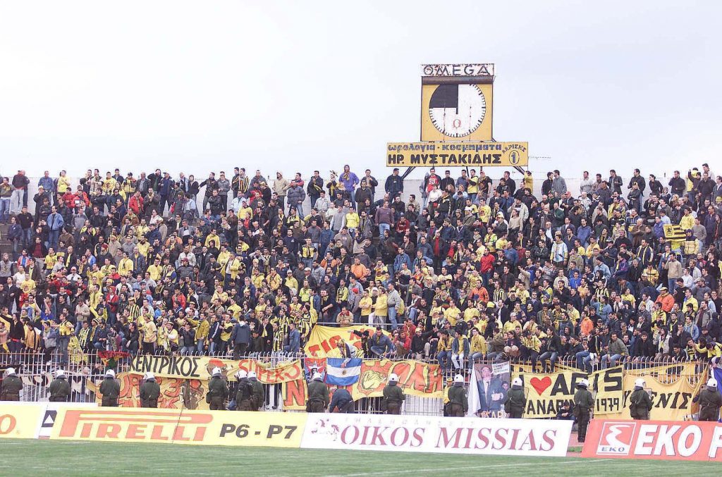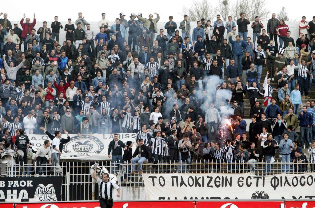 Οπαδοί του Άρη και του ΠΑΟΚ στα Τρίκαλα με γηπεδούχο τον τιμωρημένο ΠΑΟΚ τον Απρίλιο του 2003.