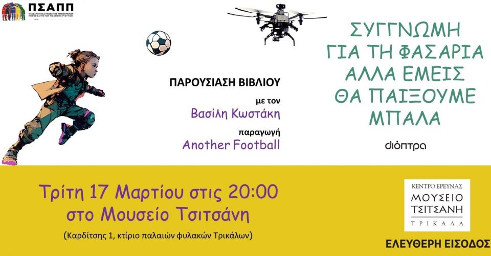 Την Τρίτη 17 Μαρτίου στις 20:00 στο Μουσείο Τσιτσάνη θα παρουσιαστεί το εικονογραφηένο βιβλίο “Συγγνώμη για τη φασαρία αλλά εμείς θα παίξουμε μπάλα. Ένα βιβλίο για μικρούς και μεγάλους από τον Βασίλη Κωστάκη και το Another Football.