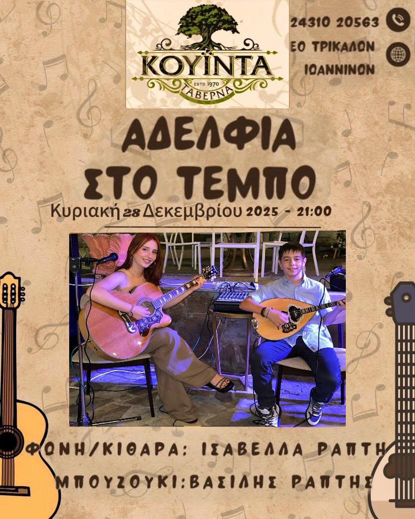 Μια ξεχωριστή μουσική βραδιά έρχεται την Κυριακή 28 Δεκεμβρίου 2025, στις 21:00, στην αγαπημένη ταβέρνα «Κουίντα», επί της Ε.Ο. Τρικάλων – Ιωαννίνων, προσκαλώντας το κοινό σε ένα live γεμάτο συναίσθημα, ρυθμό και αυθεντικό ελληνικό ήχο.